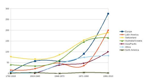 National level referendum frequencies worldwide by continent, with Switzerland singled out, 1792-2010